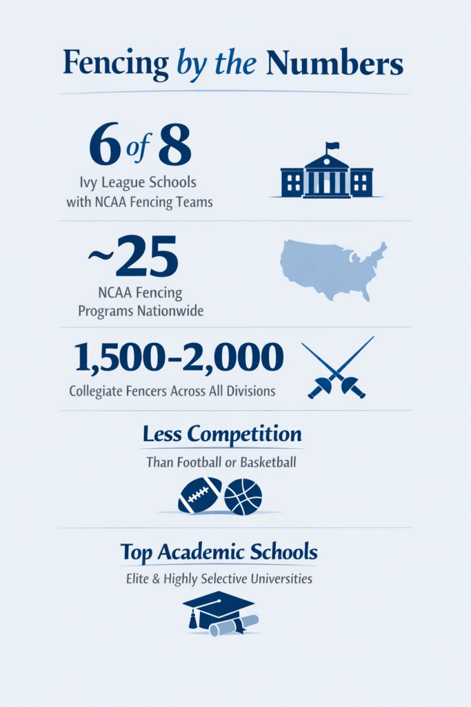 As an NCAA-recognized sport, fencing creates opportunities for recruitment at top universities, including highly selective programs. Because fewer students pursue fencing compared to traditional sports, dedicated athletes often stand out more to college coaches.